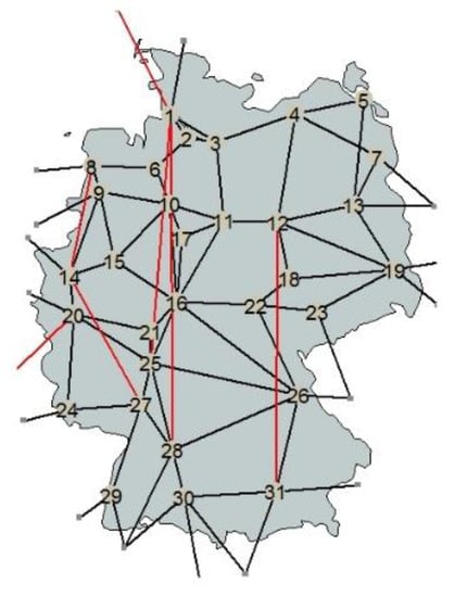 An aggregated model of the European Transmission System consisting of 200 nodes [28] is used. From these 200 nodes, 31 nodes are located in Germany. The aggregated grid model of Germany can be seen in Figure 7 and it is described in [28]. It is a cutout of the whole ENTSO-E aggregated model. For the year 2025, the grid expansion measures described in NEP 2013, 2nd edition, are added [5]. Only lines and cross-border lines (AC and HVDC) that are situated in Germany or connected to German grid nodes are considered. Figure 7 shows the used grid nodes and lines. The considered weather stations (Figure 2) are collated to these grid nodes.