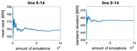 It can be seen that with the specified maximum number of 100,000 simulations, the fluctuations in mean values and standard deviations have largely subsided. The greatest fluctuations can be seen on line 1–3. Figure 8 and Figure 9 show the development of the mean values and standard deviation depending on the number of simulations for line 1–3 and line 9–14. In the following, the MCS with 100,000 simulation runs is used. The samples are generated using the copula with the algorithm that is presented in [24]. As a result, samples for wind speeds, solar irradiance, the total electric load, and values for CBF arise. Two models are developed to determine the wind power and solar power generation at each grid node. The wind generation model determines the wind speed on hub´s height first. Then, it calculates the wind power by applying aggregated power curves based on power curves for common on- and offshore wind generators. The PV model computes the power curve of an aggregated PV module depending on the solar irradiance. The inverter is assumed to be able to keep the PV module in its maximum power point (MPP). The samples for CBF define the import to DE and export from DE, respectively. They are distributed to the corresponding foreign grid nodes. With more than one grid node in each country, the sampled CBF are equally distributed.