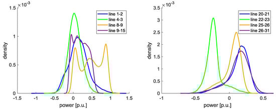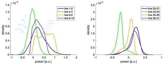 For all 100,000 samples load flow calculations are executed. Exemplarily, in Figure 11, the load flow between the lines 1–2, 4–3, 8–9, and 9–15 (left), and between the lines 20–21, 22–23, 25–26, and 26–31 (right) are shown. Here, the HVDC lines are neglected. It can be seen that line 1–2 and line 8–9 are partly overloaded. The probability that line 1–2 exceeds 1 p.u. is 2.32% and that line 8–9 exceeds 1 p.u. is 5.82%.