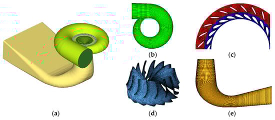 Geometry and mesh in the current simulation for (a) total, (b) spiral case, (c) tandem cascade, (d) blade, and (e) draft tube.