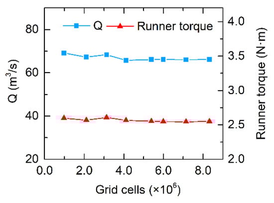The Francis turbine investigated in this study is a prototype that operates in a hydropower plant in China. Its design head is 116.0 m, the rated volume flow rate is 87.72 m3/s, the rated power output is 90 MW, and the designed rotational speed is 250 r/min. Figure 1a shows the whole turbine geometry in the following simulations. Figure 1b–e presents the discretization of a spiral case, a tandem cascade, a runner blade, and a draft tube, respectively. The computational domain includes five subdomains, i.e., a spiral case, a region with 24 stay vanes, a region with 24 guide vanes, a region with 15 runner blades, and a draft tube. Two kinds of mesh were created for these five domains via TurboGrid 14.5 and ANSYS ICEM 14.5 to produce high-quality grids. The spiral case, stay and guide vanes, and draft tube were discretized using hexahedral grids, while tetrahedral grids were generated in the runner. As for the number of grids, eight different sizes of grids with element numbers varying from 0.98 × 106 to 8.32 × 106 were created at 18 deg guide vane opening to conduct the mesh sensitivity analysis (see Figure 2). After confirmation of the variation of average volume flow rate and runner torque with the grid number and taking into account the trade-off between the required computational resources and the calculation accuracy, a total number of 4.12 × 106 grids was used for the subsequent investigation (see Table 1).