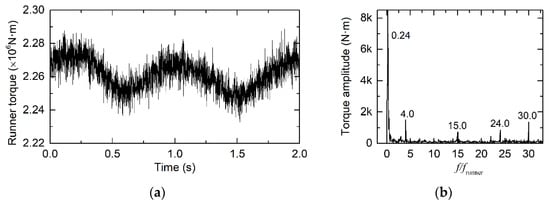 Time and frequency domain of runner torque (16 deg GVO). (a) Time history record and (b) frequency spectrum.