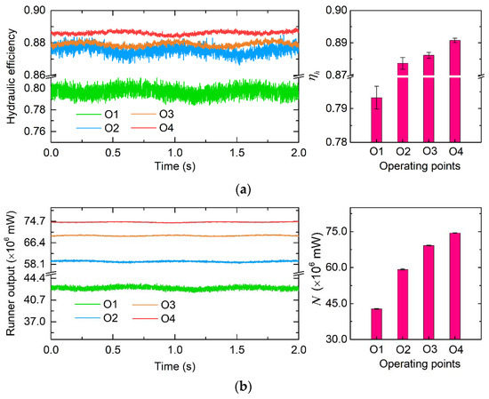 The hydraulic efficiency and the runner output of the turbine can be calculated in accordance with Equations (1)–(3), as shown in Figure 5. The aforementioned analysis indicates that hydraulic efficiency and runner output decrease as the operating condition deviates from the BEP. Please note that for the O1 operating point, the hydraulic efficiency drops dramatically, therefore Francis turbine should be operated within a reasonable operating range, so as to avoid operation which is too far away BEP and corresponding hydraulic efficiency is able to maintain at a desirable level. On the other hand, the output of Francis turbine should satisfy the demand of end-users, some measures should be taken to promote the consumption of excess power produced by Francis turbine. For example, support the construction of transmission line to large factories that can function with varying power input (e.g., aluminum smelter); enhance the planning and construction of power transmission channels for the mutual benefit of hydropower and coal-fired power; adjust the pricing strategy for the consumption of excess power and increase local absorption and electricity delivering.