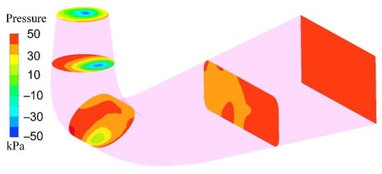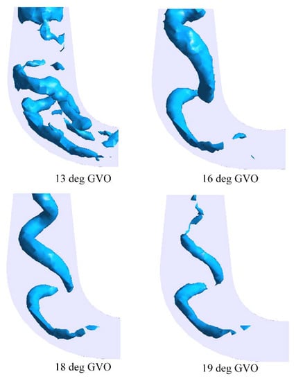 The flow instabilities in a Francis turbine draft tube under partial load conditions are closely related to the formation of a helical processing vortex, also known as the vortex rope. The iso-surfaces of swirling strength, λ3D = 0.01 s−1, were adopted to illustrate the evolution of the vortex structure in this paper (see help of CFD-Post for derivation of λ3D). The spiral vortex ropes generated under the four different GVOs are presented in Figure 6. A distinct vortex rope is observed for operating conditions of 16, 18, and 19 deg GVOs; it could be deduced that the volume of the vortex rope becomes smaller when the operating point is closer to the BEP. For the operating condition of 13 deg GVO, the vortex shedding is so intense that no major vortex rope is formed, instead resulting in a fragmented vortex core. The rotating vortex rope induces an uneven pressure distribution in the same cross section, as displayed in Figure 7. There exists a negative pressure zone in the central region as a result of low rotational velocity, while the peripheral rotational velocity is comparatively large. The pressure increases gradually along the radial direction, and the radial distribution of pressure is relatively uniform within the draft tube cone. The above analysis indicates that vortex rope and pressure distribution are caused by the large tangential component of the velocity at the runner outlet under the partial load condition. Therefore, countermeasures for alleviating the pressure fluctuations within draft tube could be proposed by reducing the tangential velocity of the flow in the draft tube inlet.