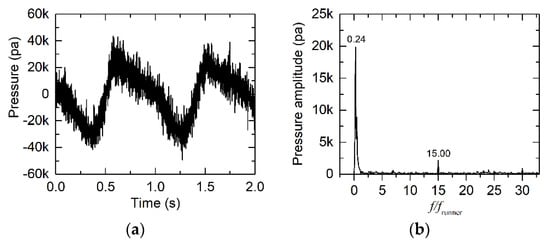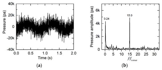 The recording points located in the runner surface rotate with the runner; in this way, the data are able to reflect the pressures on the blade during operation. The time domain plot of the pressure fluctuation of R1p for the 16 deg GVO condition is presented in Figure 11a. It is evident that the periodic behavior of the pressure fluctuation is more complicated for the points belonging to the runner blade than those of the draft tube wall. After conducting FFT analysis, three kinds of dominant frequencies could be observed in Figure 11b. For the low frequencies of 0.24, 0.72, 0.96, and 1.92 times that of the runner rotational frequency, they correspond to the rotating vortex rope (RVR) frequency and its harmonics. It is worth noting that the highest amplitude corresponds to the fourth harmonic of the RVR frequency. The high frequency of 15.0 times that of the runner rotational frequency pertains to the blade passing frequency. This RSI frequency (frunner) was also confirmed in the numerical simulations of Francis turbines performed by Zhu et al. [30]. However, it could not be found in the numerical results of Francis pump-turbines conducted by Trivedi [31]. The other high frequency of 24.0 times that of the runner rotational frequency belongs to the guide vane passing frequency. This particular RSI frequency (fgv) was also detected by Trivedi et al. [28,32].