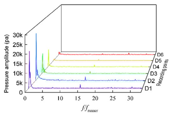 During the partial load operation of a Francis turbine, the violent pressure fluctuations are associated with the formation of the vortex rope in the draft tube. Figure 8a presents the variation in wall pressure (normalized by subtracting the average pressure and same practice was applied to following time domain figures) with time at point D1 located 2.35 m downstream of the draft tube inlet. As can be seen from Figure 8a, there exists two kinds of periodic behaviors which can be separated by FFT analysis. As demonstrated in Figure 8b, the main pressure fluctuation and its harmonics brought about by the vortex rope exhibit low-frequency and high-amplitude characteristics. The precession frequency is 0.24 times that of the runner rotational frequency, which is consistent with the value of 0.2–0.4 times that of the runner rotational frequency presented in earlier studies [17,22,26,27]. It should be noted that a frequency of 15.0 times that of the runner rotational frequency is also found, which corresponds to the number of runner blades and signals that the pressure wave is able to travel from the runner domain to the draft tube wall in the whole hydraulic circuit. This amplitude of RSI frequency (frunner) was also confirmed in the experimental and numerical studies performed by Trivedi et al. [28,29].