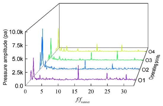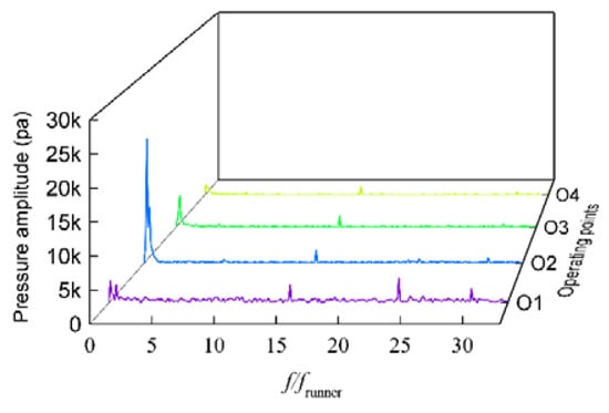 Spectral analysis of the pressure signals of R1p in the runner under the four different operating conditions.