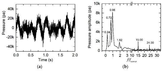 Pressure fluctuations of V1 in the vaneless space (16 deg GVO): (a) time history record and (b) normalized frequency spectrum.