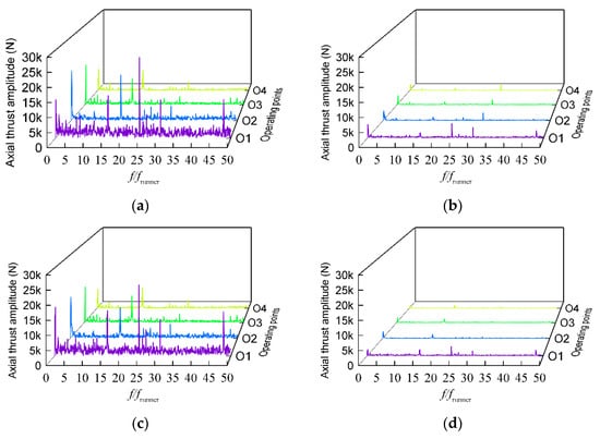 Spectral analysis of hydraulic axial thrust under the four different operating points for (a) total, (b) blade, (c) hub, and (d) shroud.