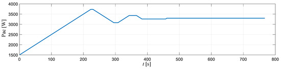 The power consumption used by an air conditioning (AC) system during travelling can be dynamically changed and escalate the energy usage of vehicle by 12%–17% [18]. Other auxiliary powers were quite small compared with the total power consumption of the vehicle. Therefore, in this study, only the AC power consumption was considered, and the rest of the losses related to other auxiliary power loads assumed to be considered within the mechanical losses. In order to represent an EMS able to reduce the energy consumption of a vehicle when its AC system was in use, it was assumed a model that considers that the mass flow rate of the air was regulated by dynamically adjusting the blower speed and air-gates opening [19]. This model takes into account up to nine various heat and loads circumstances: (1) metabolic heat load; (2) direct solar radiation load; (3) diffuse solar radiation load; (4) radiation reflected by the road; (5) ambient load; (6) exhaust heat content; (7) engine heat; (8) ventilation load; and (9) evaporator heat [19]. Figure 5 depicts the AC system power consumption which determined by using a model in [19].