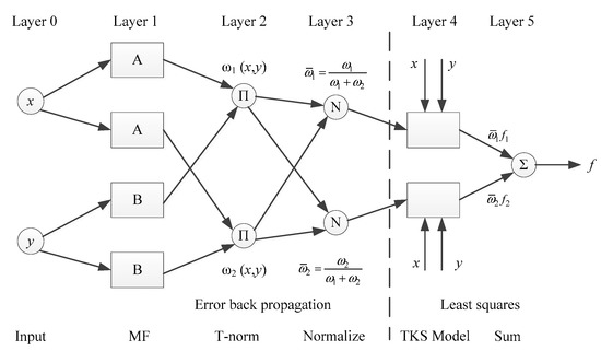 According to the combination of fuzzy inference and artificial neural network, NF inferences were divided into two categories: the Mamdani system [21] and the Takagi-Sugeno system [22,23]. The former model has the form of a fuzzy set at the rule conclusion. The form of the latter model was a first-order linear equation at the rule conclusion for the input variable. The Tankagi-Sugeno model has advantages over the Mamdani model, including the efficiency in terms of computational ability, and the adaption in producing rules in combination with the optimal method of artificial neural network. Therefore, Takagi-Sugeno was chosen to be implemented in the NF system for the configuration of the fuzzy rules system in this study. The structure consists of five following layers, as shown in Figure 9.