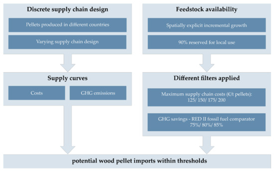 When using “wood pellets” or “pellets” in the remainder of this article, this is always in reference to regular pellets from forestry biomass. The selection of sourcing countries was based on current pellet production and consumption and on the potential for future production increases [5,7,18,19]. Supply chain costs and GHG supply curves of potential pellet production and trade were constructed based on the locations of export ports suitable for pellet export, within the including sourcing countries. Results from costs and emission analyses were used in the calculation of maximum supply areas and the total potential pellet production that can be supplied from these areas. This potential was calculated based on incremental growth of forestry biomass in spatially explicit forestry areas. Areas assumed high in biodiversity were subtracted from the total area, including protected areas and areas previously untouched by human exploration, considered a good estimation of the extent of primary forests. Of the incremental growth, a share of 90% was assumed to be reserved for existing local energy and material use. The GHG emission thresholds used were the 70% and 80% included in the RED II standards, as well as 85% in reflection of further tightening of emission criteria. Calculations were based on the fossil fuel comparator for electricity and heat production as outlined by the Joint Research Centre (JRC) [20]. These comparators represent typical or default GHG emissions of fossil electricity and heat production, and are based on a marginal mix of present and perspective power production and feedstocks [20].