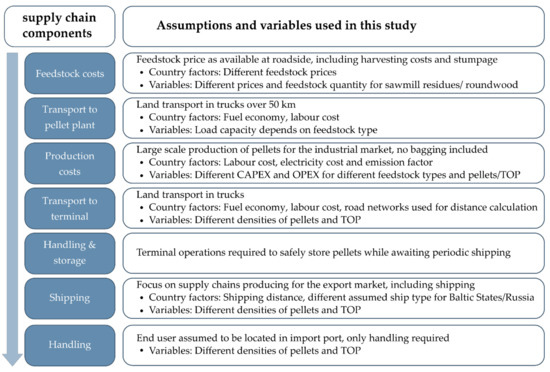 This work consists of a few different components, see Figure 1. Firstly, supply chain design costs and emissions were calculated for discrete supply chains from selected sourcing countries (United States, Canada, Brazil, Estonia, Latvia, Lithuania, Russia). Certain supply chain design characteristics were varied to analyse the impact on total costs and emissions, specifically the choice between pulpwood and sawmill residues, and the distinction between wood pellets and torrefied pellets. The impact of inland transport distance was also calculated. See Figure 2 for the impact of design variables on the included cost components. Secondly, pellet production potentials were calculated in the different countries based on feedstock availability in forests. These two parts were combined to generate costs and GHG supply curves, including the impact of inland transport. By applying different cost and emission criteria, the total potential availability of pellets under different circumstances was analysed.