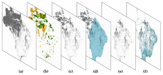 (a) Example of forestry feedstock availability calculation for Brazil, based on total area classified as forest vegetation by the Instituto Brasiliero de Geografia e Estatistica [65]; (b) Protected areas (green) and areas inhabited by indigenous people (orange), were based on data from [66,67,68]; (c) Forestry feedstock availability minus protected areas as shown in (b); (d) Only the areas within 2000 km from selected export ports were considered feasible for mobilization; (e) The resulting remaining potential areas for pellet production; (f) As the final step, OpenStreetMap road infrastructure, adapted from [64], was used to calculate transport costs.