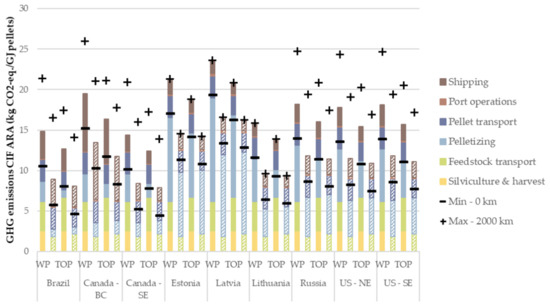 Supply chain greenhouse gas emissions for wood pellets and torrefied pellets made from pulpwood (solid) and sawmill residues (striped), for all analysed countries. Total emissions were based on feedstock transport distance of 50 km and pellet transport distance of 500 km. As a sensitivity, minimum and maximum values are shown based on transport distance of pellets between 0–2000 km. Maximum transport distance in the Baltic States remains 500 km, which is the maximum distance possible in these smaller countries. Shipping transport was calculated for Handymax ships, except for the Baltic States in which case the use of a short sea ship (SSS) was assumed.