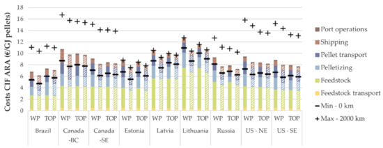 Supply chain costs for wood pellets and torrefied pellets made from pulpwood (solid) and sawmill residues (striped), for all analysed countries. Total costs were based on feedstock transport distance of 50 km and pellet transport distance of 500 km. As a sensitivity, minimum and maximum values are shown based on transport distance of pellets between 0–2000 km. Maximum transport distance in the Baltic States remains 500 km, which is the maximum distance possible in these smaller countries. Shipping transport was calculated for Handymax ships, except for the Baltic States in which case the use of a short sea ship was assumed.