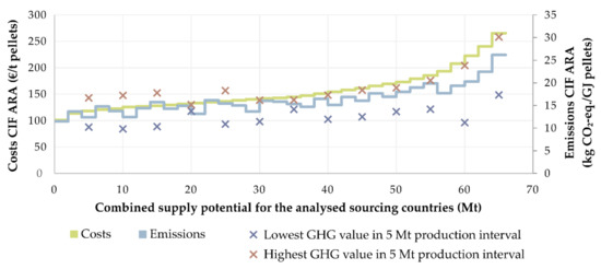 Supply curves were generated based on the production potential of pellets in each region, sorted for lowest costs and combined in intervals of 2 Mt production potential. The average costs and emission values for each interval was used to construct the line charts shown in Figure 6.