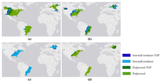Maximum supply area of pellets made from sawmill residues and pulpwood when applying (a) GHG emissions savings; (b) 80% GHG emission savings; (c,d) €150 /t pellets CIF ARA for wood pellets, corresponding to €171 t/pellets CIF ARA for torrefied pellets, in proportion to the higher energy density.