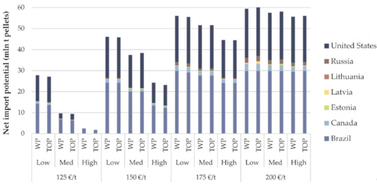 The potential production of pellets in the different countries is limited by the availability of feedstock as well as costs and emissions of pellet production and transport. Figure 8 shows the techno-economic pellet production potential of pellets made from roundwood in the different countries analysed. The potential as limited by supply chain costs, is largest in Brazil and the US. The least restricted scenario, the Low-cost scenario, at 200 €/t pellets gives a total potential of almost 60 million tonnes of pellets, of which 50% is sourced from Brazil and 39% from the US. Total availability of forestry feedstock in the Baltic countries is small and prices of feedstock are high, resulting in a very low potential. Feedstock prices are more competitive in Canada and Russia. However, the main forestry potential in these regions is located more inland, at large transport distance from export regions, limiting the available feedstock for pelletization. The total potential from all countries is significantly impacted by supply chain costs limits. At the other end of the range, at an assumed cost limit of 125 €/t pellets, the total potential varies between 3–28 million tonnes in the different scenarios. Since the difference in costs between WP and TOP is very small, results are also very similar. Overall for TOP, the potential from Brazil is slightly lower and the potential from the US slightly higher. The total potential of torrefied pellet production and import falls within 95–103% of the wood pellet potential.