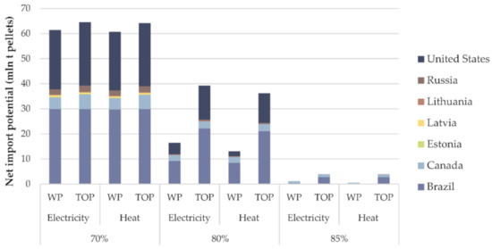 This study is not a full analysis of global feedstock availability, and other major pellet production regions, such as China and Vietnam, were not included [6]. On the other hand, other growing demand regions, such as Japan and South-Korea were also not considered [72]. For a complete analysis on potential wood pellet imports, the local competition for feedstock as well as the international competition for pellets needs to be considered in future work.