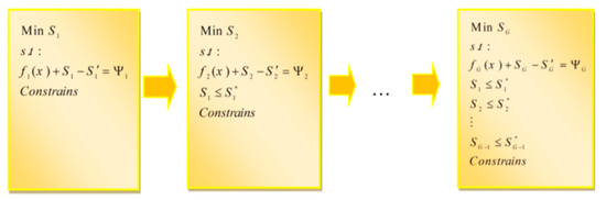 where ug and are binary variables that show that only one of Sg or can be higher than zero. To solve the objective function (2), there are different methods. In this study, we use the Sequential Linear Goal Programming (SLGP) method to solve a linear GP function, as shown in Figure 1.