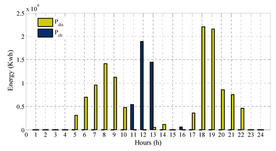 To optimize the scheduling of the EVA in the day-ahead market, the expected value of contract price has been utilized, which is equal to $0.056 per kWh. By taking into account this value as a final contract price, the expected profit for the aggregator is computed as equal to $3375.381, and the optimal scheduling of EVAs is depicted in Figure 3. According to the figure, the aggregator tends to charge batteries with low energy prices while selling stored power during peak periods.
