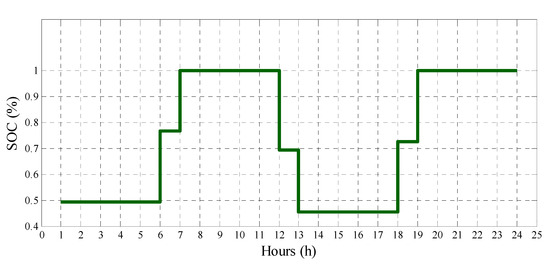 Additionally, the state of charge for EV type 1 in Scenario 4 is shown in Figure 4. As seen, the SOC is not lower than the minimum constraint, and eventually, the value of SOC is equal to 100% at the end of the available time. Moreover, the battery is charged at lower prices, and then it is discharged during hours 12 and 13 when the price of energy is high. The battery stays idle for 4 hours, and then at hours 18 and 19 is charged to be delivered with 100 percent of SOC at departure time.