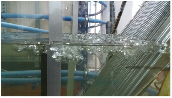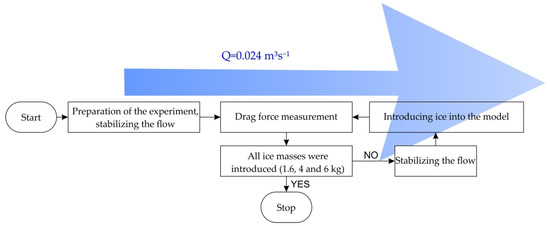 An ice jam on trash rack bars was simulated with 0.05 × 0.05 m ice cubes used in three different weights—1.6, 4 and 6 kg. The cubes were introduced into the system near the entrance to the hydraulic flume. After reaching the trash rack bars, the cubes formed an ice jam (Figure 2). First, after stabilizing the flow, the value of drag force measured in a clean flume without ice was determined. Then ice was introduced into the model and the drag force measurement procedure was repeated (Figure 3).