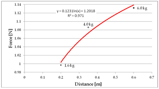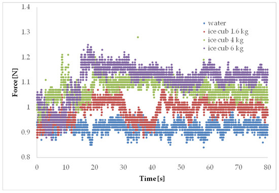By analyzing Table 1 and Figure 7, it can be observed that the drag force in the examined range increases logarithmically (Figure 8) and is correlated with the increase in ice weight and the area that blocks a free flow of water. The average value of the force F (and Standard Deviation) for ice mass 1.4, 4 and 6 kg were 0.997 (SD = 0.0315), 1.081 (0.0284) and 1.13 (0.0266), respectively. Based on the value of the Reynolds number, the flow rate can be characterized as transient. Böttcher et al. [48] demonstrated that the head loss coefficient is independent from the Reynolds number in a range from 750 to 3500 and increases with an increasing blockage ratio and angle of trash racks.