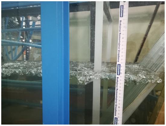 During the study it was observed that a 1.6 kg dose of ice formed a rectangular cover that was 1.5 cm thick and 20 cm of range in the vicinity of the trash rack (Figure 5). A 4 kg dose of ice caused a blockage of free flow through the trash rack over its entire width and was 2 cm thick and approx. 35 cm of range. As the mass of introduced ice increased, its thickness at the trash rack did not change significantly, since it increased by 1 cm, whereas the ice cover range that formed in front of the trash rack build up to 60 cm (Figure 6).