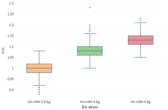 The distribution of drag force over the ice mass. The box represents the 25%–75% percentile with median marked, the whiskers are represented upper and lower fences (1.5× the inner quartile range). Dots represent outliers.
