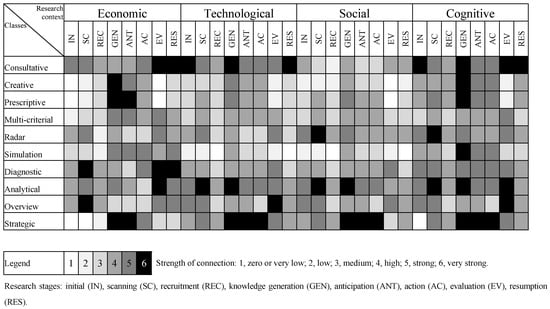 The strength of connecting a given class of methods at particular stages in the foresight process, in the context of the economic, social, technological and cognitive aspects [82].