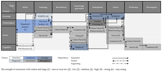The selection of the research context and the choice of methods are strongly interdependent and directly related to the individual stages of foresight research. Each class forms groups of methods that are mutually substitutable and complementary to those in other classes. Methods from only one class should not be used. Such an approach may cause an undesirable effect, in which methods based on similar information resources will generate results in a similar way. Such a situation will make it impossible to obtain the synergistic effect [92]. Proper methodology will be ensured by selecting methods from different classes in each phase. At the same time, it is important to provide a strong reference to all research contexts. Putting too weak an emphasis on all contexts or placing too strong a stress on one of them may lead to the undesirable dominance of a specific domain [82,92].