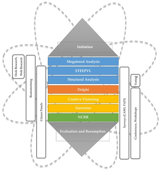 - Popper, R. Foresight methodology. In The Handbook of Technology Foresight: Concepts and Practice; Prime Series on Research and Innovation, Policy; Georghiou, L., Cassingena Harper, J., Keenan, M., Miles, I., Popper, R., Eds.; Edward Elgar: Cheltenham, Northampton, UK, 2008; pp. 44–89. [Google Scholar]