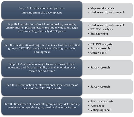 Foresight may provide an answer to the existing need to create a vision for the development of a smart city which will enable sustainable development. Among many definitions of foresight, the best-known ones were those proposed by Martin and Georghiou [47]. According to Martin, foresight is a process involved in systematic attempts to envisage the long-term future of science, technology, economy and society. This process aims to identify strategic areas of science and technology that should provide maximum economic and social benefits [48]. Georghiou, on the other hand, presents foresight as a systematic way to assess the development of science and technology, which can clearly affect industrial competitiveness, generating wealth and boosting quality of life [49].