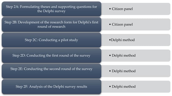 In the individual sequences of the research process, methods closely related to social participation, which are an indispensable element of foresight research, were nested. These methods include desk research, web research, citizen panels, brainstorming, surveys, workshops and conferences. Additionally, voting was indicated as an optional method to be used in the case of such a need.