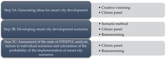 For the needs of the methodology for the planning and implementation of a vision of smart city development (Figure 2), 15 methods belonging to six different classes were chosen. These methods were selected in such a way as to maintain a balance between references to contexts (economic, technological, social and cognitive) related to the research area—the city and its individual aspects, and eight phases of foresight. The cognitive context is linked to desk research, web research, Delphi, survey and conference. The social context was expressed by megatrend analysis, citizen panels, brainstorming, workshops, conference and voting. The technological context refers to megatrend analysis, structural analysis, creative visioning and identifying actions related to the development of a smart city, divided into four categories: new, so far not undertaken (N); implemented so far, to be continued (C); redundant, to be discontinued (R); actions that have been implemented in the past and to be restored (R) (NCRR) [94], and the economic context refers to the factors analysis: social (S), technological (T), economic (E), ecological (E), political (P), relating to values (V) and legal (L) (STEEPVL) [95], scenarios and the NCRR.