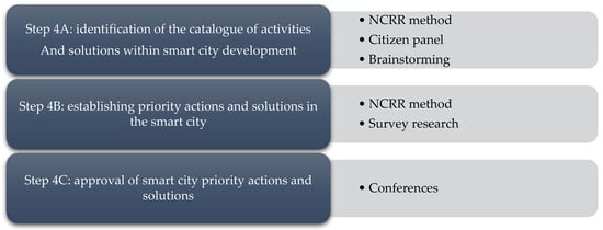 Structural and methodological complexity necessitates the operationalisation of the research methodology aimed at improved planning of different stages of the research process. The proposed methodology of planning and implementation of the vision of smart city development leads to the development of a general research scheme (Figure 3). Five main research stages were distinguished in this process: