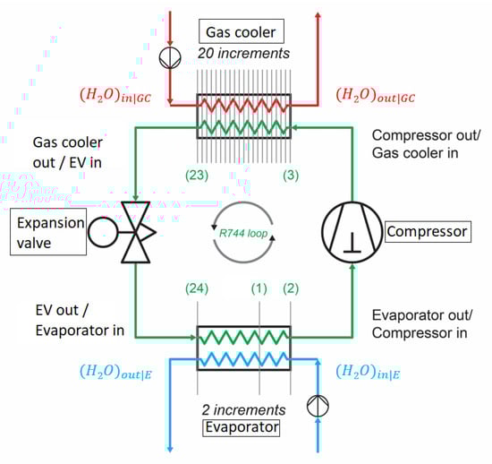 Figure 1 illustrates the water-to-water transcritical CO (R744) heat pump system with its main cyclic points and components shown. The typical thermodynamic behavior of the transcritical refrigerant loop is shown in Figure 2 on a T-s diagram.