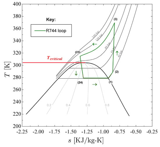 Transcritical heat pump refrigerant loop on a T-s diagram.