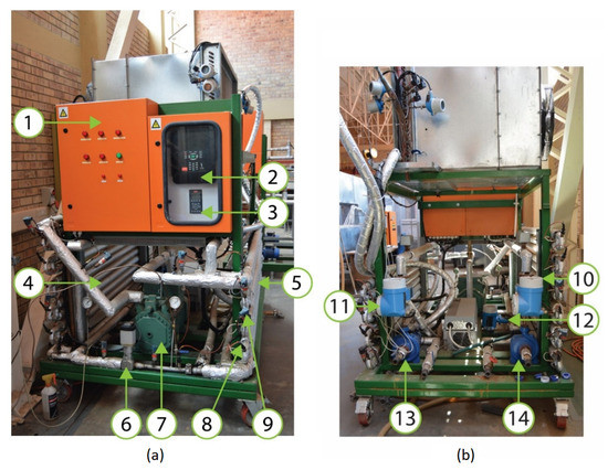 The R744 in the gas cooler component may be in either the supercritical gaseous or in the sub-cooled liquid state—cycle point (23). For proper system operation, the EV should receive R744 that is in the sub-cooled liquid state. Within the expansion valve, R744 undergoes an isenthalpic throttling process—cycle point (23) to (24). The throttling process causes the R744 to undergo a significant pressure drop. The temperature of the R744 also decreases with the reduction in its pressure. The throttling process effectively lowers the temperature so that evaporation of the R744 may again take place, via heat transfer from the water stream to the R744 in the evaporator component—cycle point (24) to (2). The actual heat pump test facility viewed from the front and the back is illustrated in Figure 3. Table 1 lists the corresponding components found in the heat pump system with their respective functions.