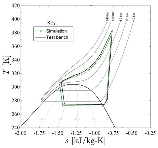 T-s diagram with overlaid experimental and simulated refrigerant cycle (30% EV orifice opening).