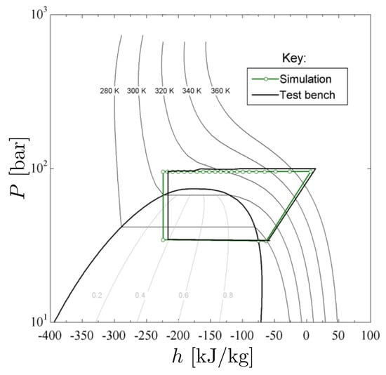 Log. P-h diagram with overlaid experimental and simulated refrigerant cycle (30% EV orifice opening).