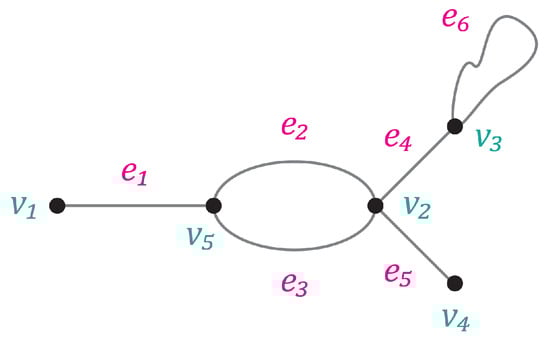 According to Rahman [29], a graph G can be defined as a tuple consisting of a finite set V of vertices and a finite set E of edges. Each edge can be represented by an unordered pair of vertices. For example, and edge e between two vertices u and v may be represented as . Balakrishnan and Ranganathan [30] gives the following formal mathematical definition of a graph: “A graph is an ordered triple , where is a nonempty set, is set disjoint from , and is an “incidence” relation that associates with each element of an unordered pair of elements (same or distinct) of .” The symbol G is thus used to denote the graph as a whole, represents the vertices of the said graph, is the graph edges and is the connection relation between the vertices and edges of the graph. Figure 6 illustrates an example of a linear graph.