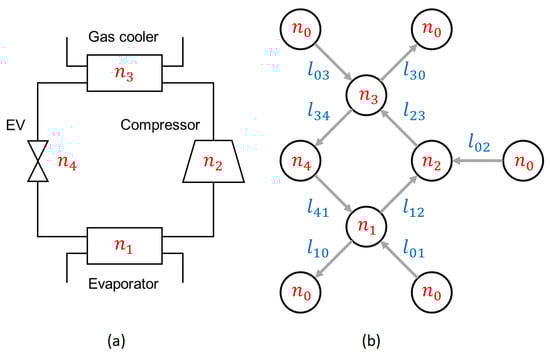 An attributed graph representation of the heat pump system: (a) schematic representation of the heat pump system, (b) graph representation.