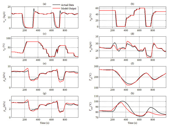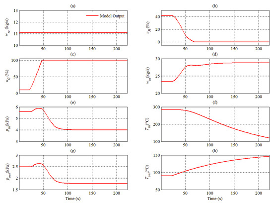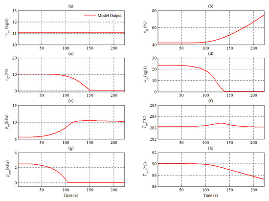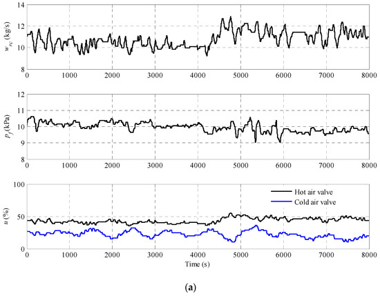 In order to verify the accuracy of the model, the actual operation data collected from massive historical database of Guodian Suqian power plant in China is taken as the model input, and then the difference between the model output and the actual output can be compared. The comparison curves of each variable are shown in Figure 3. Figure 3a shows the trends of each input variable of the system, in which the coal feed flow varies from 9 kg/s to 13 kg/s, and the hot air temperature and cold air temperature are 312 °C and 33 °C respectively; Figure 3b is the comparison curves of the inlet air flow, the inlet air temperature and the inlet air pressure of primary air system; Figure 3c is the comparison curves of the grinding current, the outlet temperature of mixture and the outlet air pressure of the mill. From the comparison curves, it can be seen that the dynamic characteristics of the model are basically the same as the actual in the period of 8000 s. The relative error of each variable is shown in Table 2, it can be found that the relative error of each output variable of the model is less than 2.53%, and the total average relative error of all outputs is about 1.2%, which shows the model has high simulation accuracy.