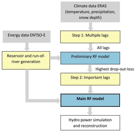 In step 1—preliminary model—all of the available lags ([0, 5, 10 … 200] days for precipitation and snow depth and [0, 5, 10… 100] days for temperature) are used to train the model; then these predictors are arranged in order of decreasing dropout loss value (the reduced amount calculated by loss function when “ignoring” one variable; for further reading, see [14]). We assume in this selection process that those lagged periods within a range of 30 days would have the same effect on hydro power production at the country level. Those in the top ten highest dropout loss values not closer than 30 days to any other lags, called the most important lags, are selected as final predictors in the main model (Step 2). The method of selecting important lags applied for different countries results in models with different predictors, specific to each country and each hydro power type. Figure 1 illustrates how the two-step approach is implemented.