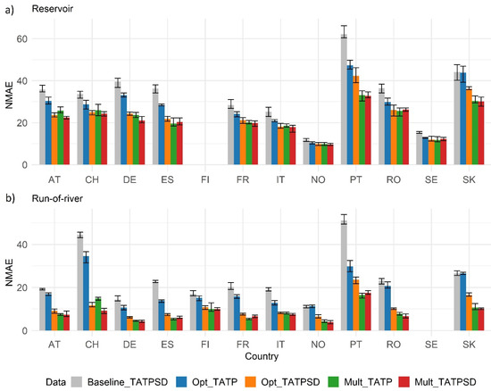 Figure 2 shows the normalised mean absolute error (NMAE) of the five model configurations under consideration. The normalisation is done by dividing the MAE by the average of all observed data. Firstly, we can see that run-of-river (lower panel) is reproduced better than reservoir-based generation (upper panel). This is expected, as run-of-river generation is influenced less by human intervention and management due to limited or none water storage. On the contrary, reservoirs are operated with optimization tools depending on situational factors such as energy market prices. Reservoir-based generation is also mechanically more difficult to simulate when considering only climate variables. The effect of climate variability, e.g., the North Atlantic Oscillation, on reservoir-based hydro power generation is weaker than on inflows due to power plant design and operator decision [15]. This impact is expected to be higher in run-of-river generation. For the same reason, snow depth impacts are more prominent in run-of-river than in reservoir-based hydro power generation.