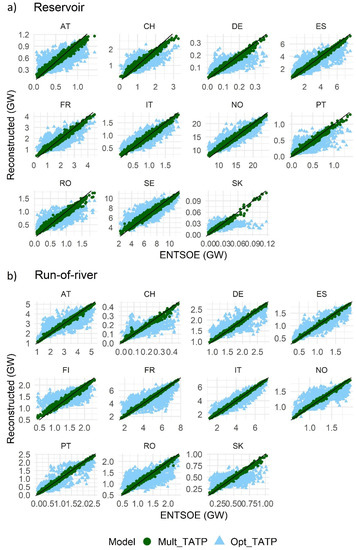 Scatter plots of hydro power generation for reservoir-based (a) and run-of-river (b) generation comparing ENTSO-E data on the x-axis and model reconstructed values on the y-axis for models (2) and (4): multiple lags of temperature and precipitation (green dots) and optimal lag (blue dots). In general, the multiple lags approach (Mult_TATP) performs better with less deviation and gives a larger improvement for run-of-river generation, while the optimal lag model (Opt_TATP) has a larger bias for extreme values.