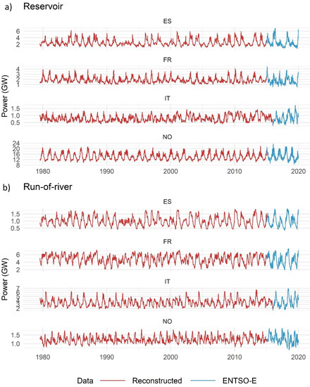 Figure 4 illustrates time series of reconstructed hydro power generation using our selected model configuration compared against data from ENTSO-E for the four countries selected as representatives. The output data show similar patterns of seasonality as ENTSO-E data but somewhat smoother, especially in the case of reservoir-based generation, due to operation regulation according to electricity demand. However, we are confident that the main features of hydro power generation are well reproduced, in particular high- and low-generation events corresponding to low-frequency precipitation variability.